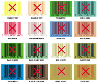 Chart 2 : shows colors that should not be used because either they do not have enough contrast or they can not be read by the scanner. The darker color on the bar-code must be able to be seen through WRATTEN 26 red filter. (It is a red filter similar to that used in three dimensional glasses.)