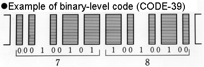 A method of the automatic recognition which enables to input alphabet, numeral, mark, etc. digitally into the computer by replacing them under an algorithm, to the 1-dimentional black/white pattern (actually 2-D for it has several width).